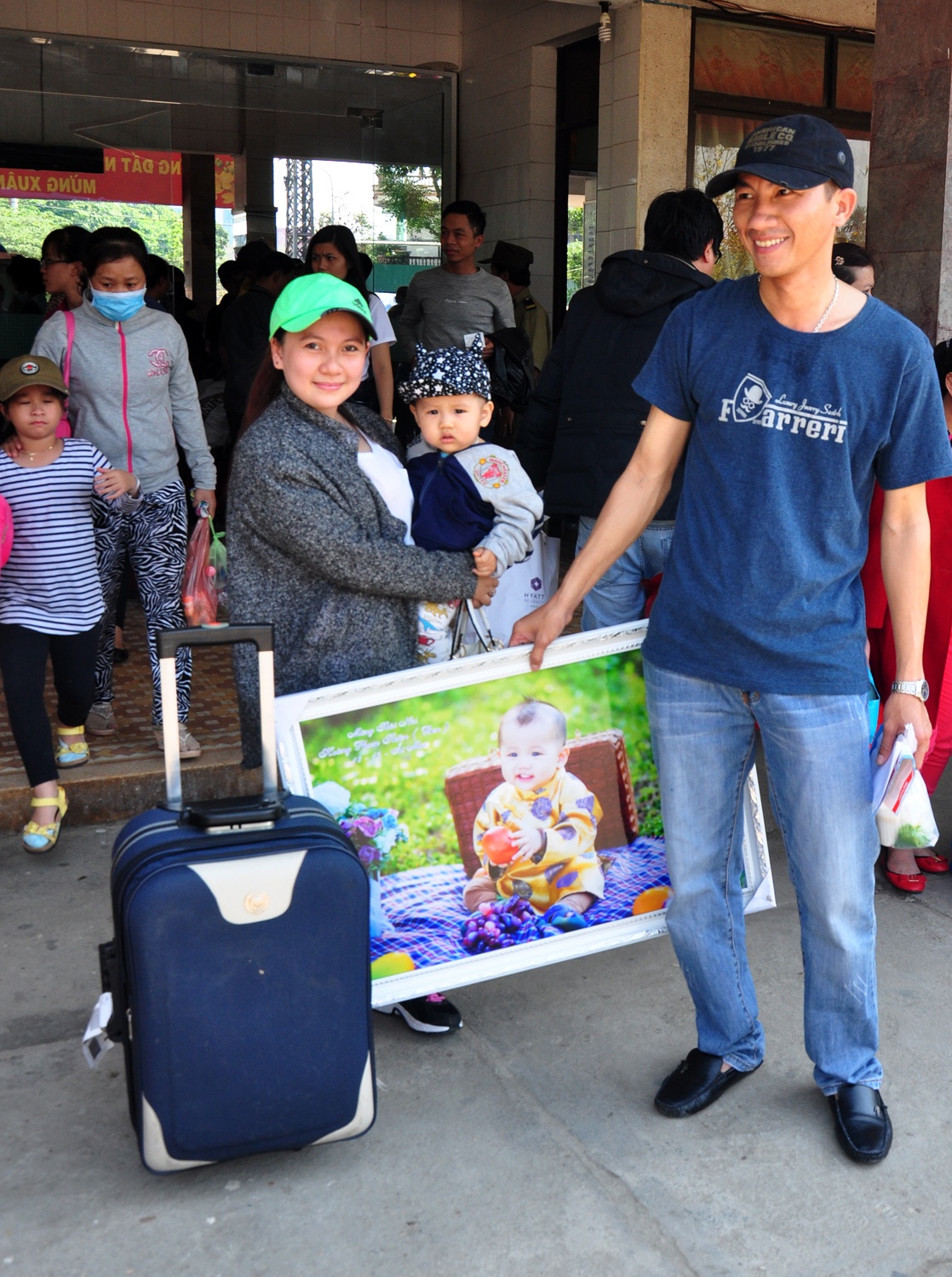 | Cùng vợ, con rời Quảng Ngãi sau những ngày nghỉ tết, anh Hoàng Minh Thắng (ngụ Quảng Bình) hạnh phúc với hành trang mùa xuân mới là tấm ảnh phóng lớn của con trai - lễ Thôi nôi tròn 1 tuổi đúng dịp tết Bính Thân. |