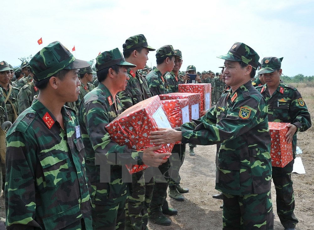| Lãnh đạo Binh đoàn Cửu Long tặng quà, chúc mừng các đơn vị tham gia diễn tập. |