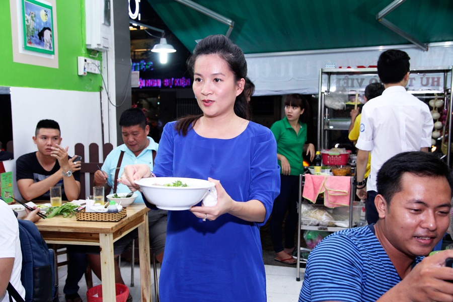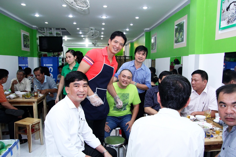Buổi khai trương giản dị của quán hủ tiếu có sự góp mặt của một số nghệ sĩ thân thiết với Bình Minh. Siêu mẫu Xuân Lan tranh thủ lịch ghi hình của Vietnam's Next Top Model để đến dự.