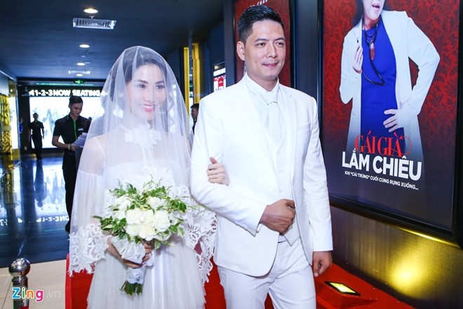 | Bình Minh - Diễm My diện trang phục cưới gây ấn tượng trong buổi họp báo. Ảnh: Nguyễn Thành |