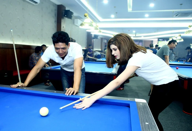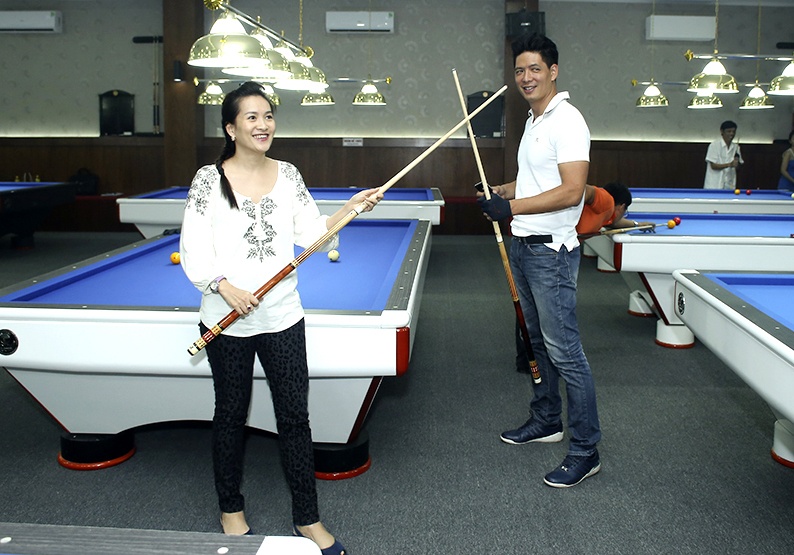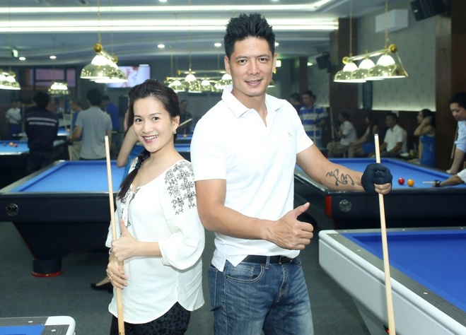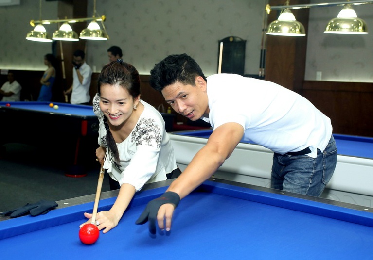 | Nam diễn viên - MC nhiệt tình hướng dẫn bà xã cách chơi bida. Lần đầu tiên đến với trò chơi dành cho phái mạnh, doanh nhân Anh Thơ khá lúng túng dù có chồng ở cạnh hỗ trợ. |