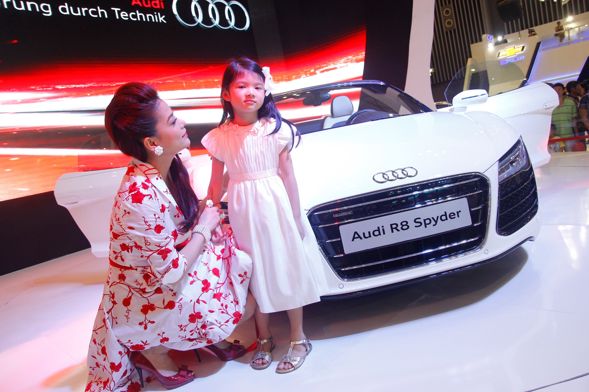 | Tiểu thư nhà Trương Ngọc Ánh nũng nịu khi lên chụp hình cùng mẹ với R8 Spyder. |