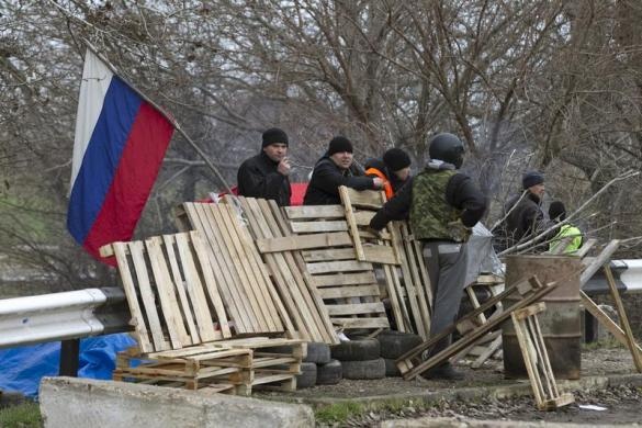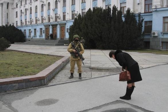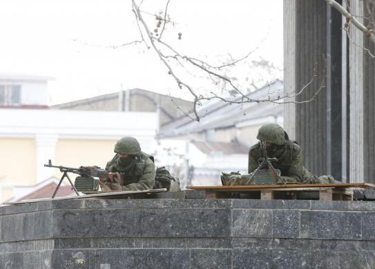 | Lính vũ trang đang canh giữ tòa nhà quốc hội ở thủ phủ Simferopol của bán đảo Crimea ngày 1/3. Phương Tây cáo buộc đó là binh sĩ Nga nhưng Moscow phủ nhận thông tin này. Ảnh: Reuters. |