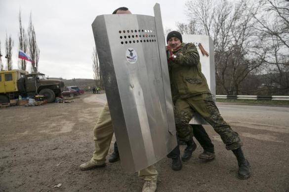 | Những dân quân tự vệ thân Nga đang luyện tập gần sân bay Belbel ở Crimea. Ảnh: Reuters. |