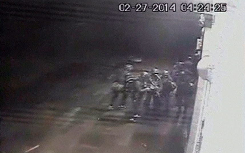 | Những hình ảnh từ camera cho thấy những kẻ có vũ trang xông vào tòa nhà quốc hội ở Simferopol ngày 27/2. Nhiều nguồn tin cho biết Nga đã nắm nhiều tòa nhà quan trọng ở Crimea như tòa nhà quốc hội, sân bay. Ảnh: Reuters. |