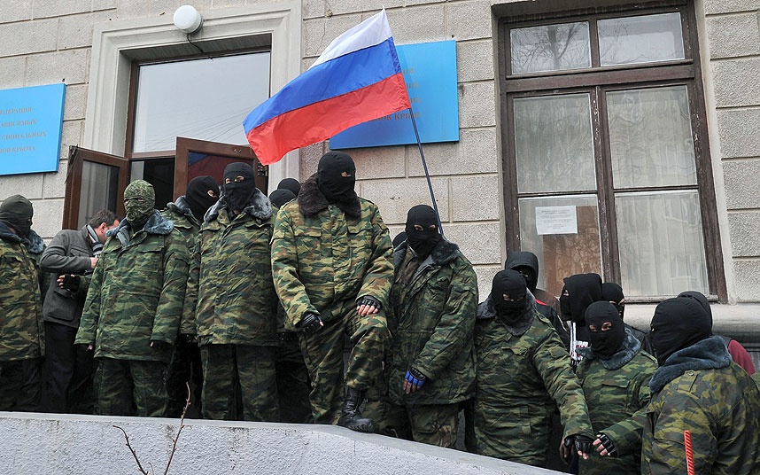 | Những người đeo mặt nạ cầm cờ Nga, chiếm tòa nhà thương mại ở Simferopol ngày 28/2. Ảnh: Getty Images |