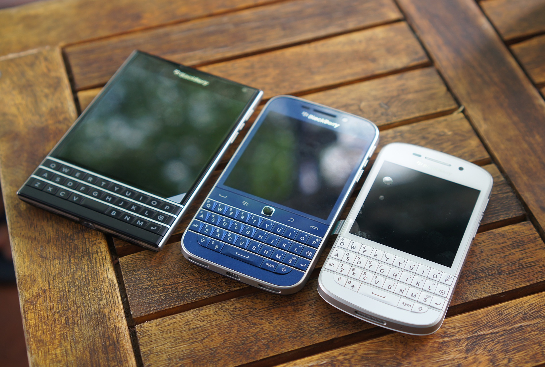 | BlackBerry Classic màu xanh cobalt (giữa) đọ dáng với Passport (trái) và Q10 (phải). Giá tham khảo của BlackBerry Passport là 11,49 triệu đồng, Q10 là 4,49 triệu đồng. |