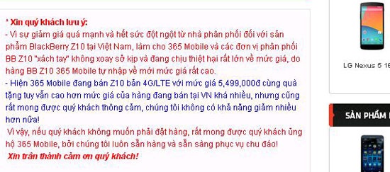 Thậm chí, tại trang web của cửa hàng Mobile 365 (Hà Nội) còn cho đăng “tâm thư” với nội dung: “Xin quý khách lưu ý: Vì sự giảm giá quá mạnh và hết sức đột ngột từ nhà phân phối đối với sản phẩm BlackBerry Z10 tại Việt Nam, làm cho 365 Mobile và các đơn vị phân phối BB Z10 xách tay không xoay sở kịp và đang chịu thiệt hại rất lớn về mức giá, do hàng BlackBerry Z10 365 Mobile tự nhập về với mức giá rất cao. Hiện 365 Mobile đang bán Z10 bản 4G/LTE với mức giá 5.499 triệu đồng cùng quà tặng, tuy vẫn cao hơn mức giá của hàng đang bán tại Việt Nam khá nhiều, nhưng cũng rất mong được quý khách thông cảm. Chúng tôi không có khả năng giảm nhiều hơn nữa!”.