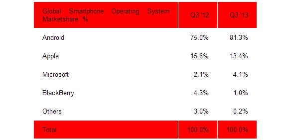 Một tin không vui đối với các tín đồ BlackBerry khi nền tảng này chỉ chiếm đúng 1% thị phần smartphone bán ra trong quý 3. Hãng sản xuất Canada chỉ bán được tổng cộng 2,5 triệu smartphone trong quý này, thấp hơn 5 triệu chiếc so với một năm trước đó. Trong khi đó, Windows Phone đã có một bước nhay vọt khi tăng đến 178% so với cùng kỳ năm ngoái.
