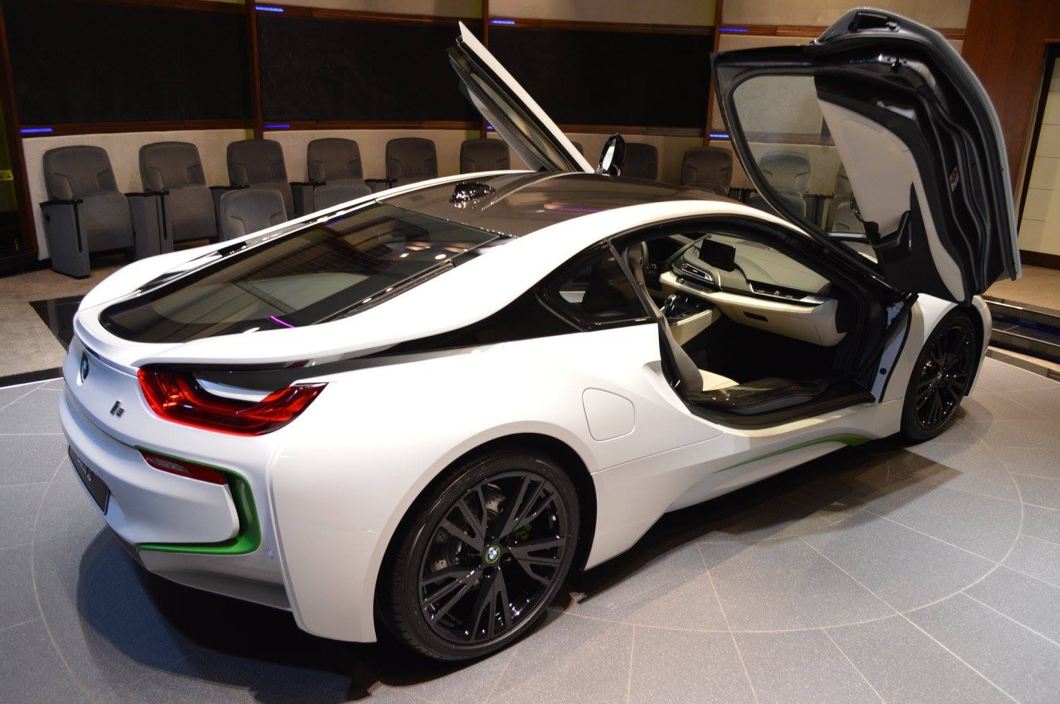 | Chiếc BMW i8 đã được thay đổi màu sơn sang trắng tinh khôi để đi cùng các chi tiết xanh lá mạ nổi bật trên nắp capo, gương chiếu hậu,... và đen đối lập ở lưới tản nhiệt, mâm xe,... |