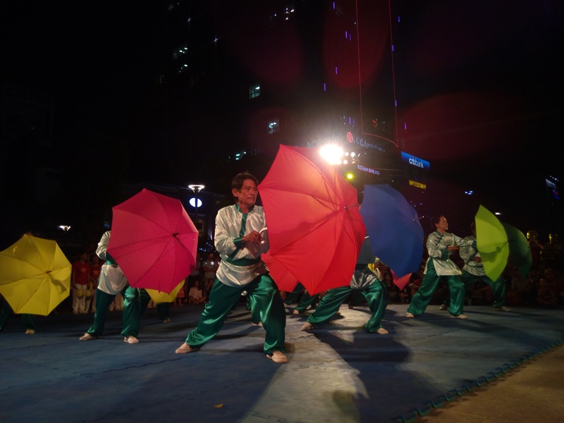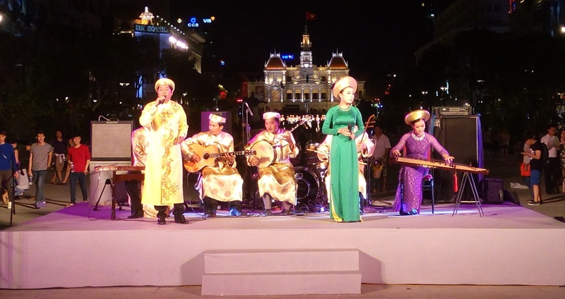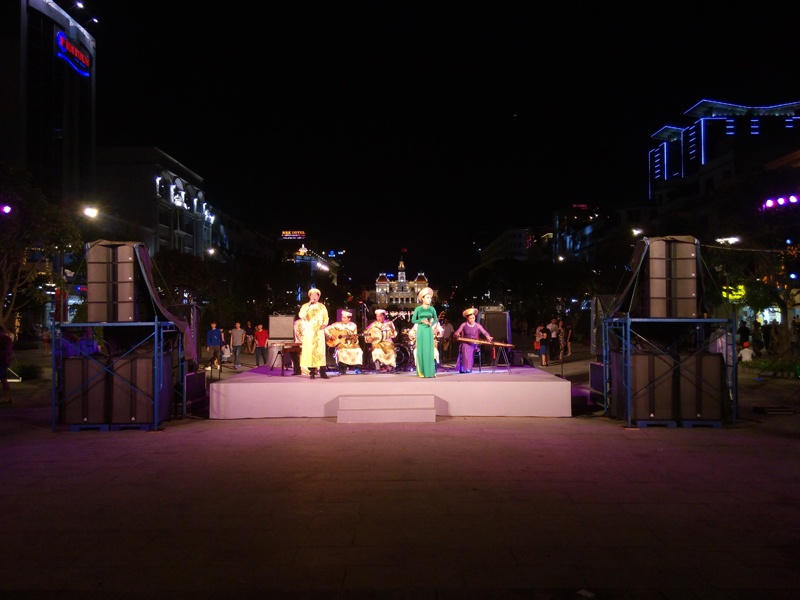 | Bức ảnh này chụp một sân khấu khác trên đường Nguyễn Huệ, sân khấu chuyên dành cho ca cổ và cải lương. Để có được bức ảnh này, người chụp đã hạ phơi sáng xuống -1 hoặc -2 để có sự cân bằng tốt nhất. |