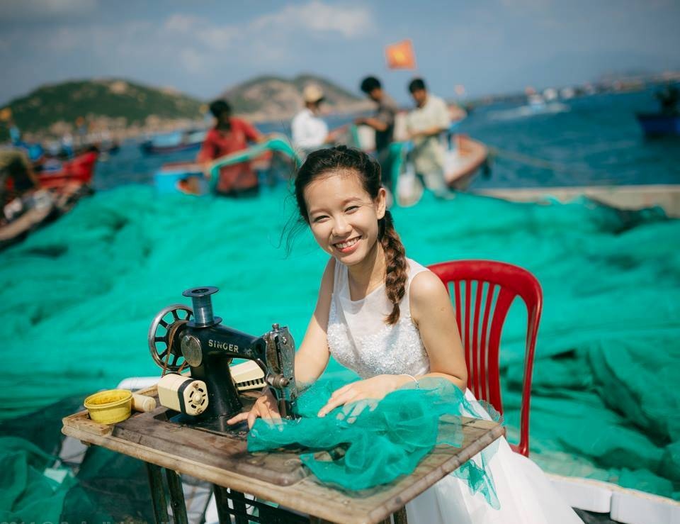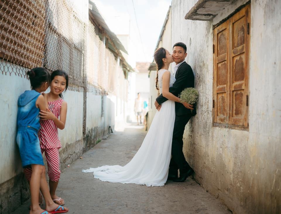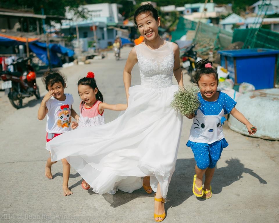 Hình ảnh cô dâu tươi tắn bên những đứa trẻ ở đảo Bình Ba, Cam Ranh, Khánh Hòa. Đây cũng là địa điểm đôi bạn thực hiện bộ ảnh này. |