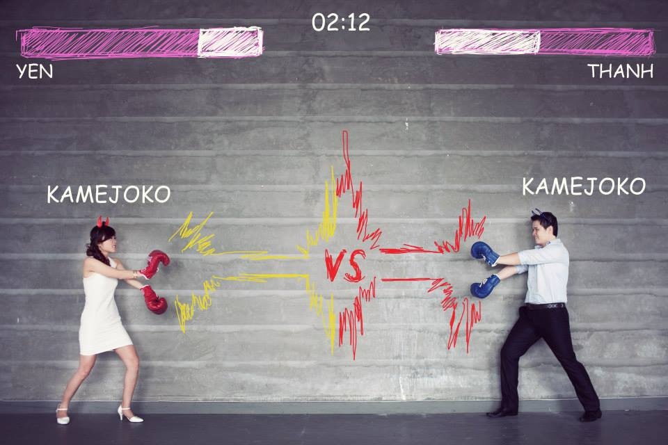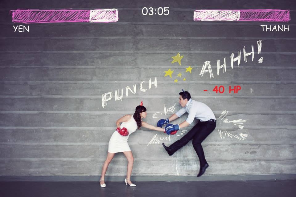 | Trong bộ ảnh, Yến luôn là người thắng thế, cô hoá nữ siêu nhân bám đuôi chồng khiến người xem thích thú. |