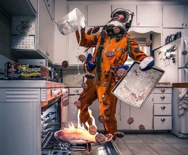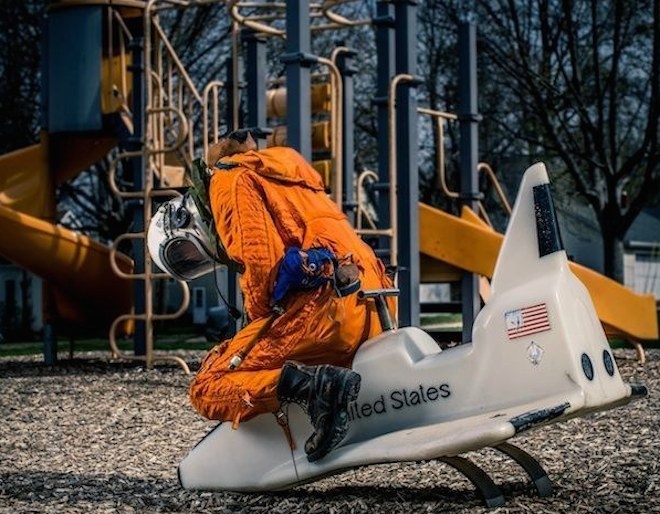 | Bộ ảnh theo phong cách siêu thực, ẩn chứa trong mỗi bức hình có vẻ hài hước, dí dỏm lại là sự cô đơn của những người làm nghề phi hành gia. |