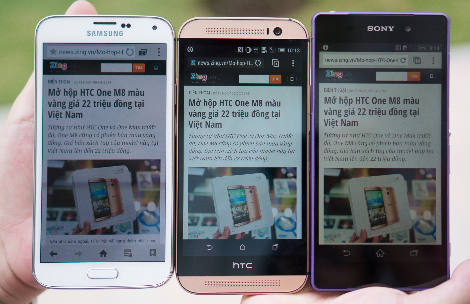 | HTC One M8 tỏ ra nổi trội nhất khi hiển thị ngoài trời, khi cả ba đều đã được chỉnh cường độ sáng lên cao nhất. Đây là 3 model sắp được bán chính hãng tại Việt Nam, trong khi trên thị trường xách tay, các phiên bản này đều đã có mặt. Tham khảo tại cửa hàng Vĩnh Phát (TP.HCM), mức giá dành cho các bản xách tay Galaxy S5 là 14,4 triệu đồng, HTC One M8 là 16,1 đến hơn 19 triệu đồng tùy màu sắc, và Xperia Z2 là 18,5 triệu đồng. |