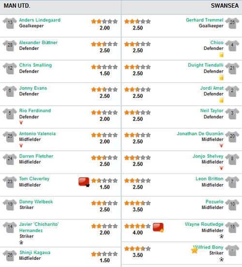 Về phía Swansea, cầu thủ nhận được điểm cao nhất là Wayne Routledge. Sau khi ghi bàn mở tỷ số, tiền vệ khoác áo số 15 còn trực tiếp thực hiện đường kiến tạo để Bony ấn định chiến thắng 2-1 cho đoàn quân do HLV Laudrup dẫn dắt. Đây cũng là cầu thủ được trang Goal chấm điểm cao nhất trận (4 cho Routledge).