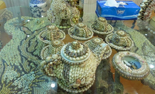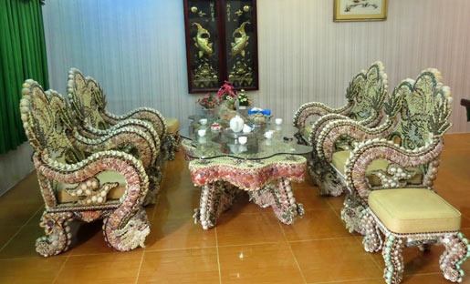 | Bộ bàn ghế được bọc từ vỏ ốc, sò gồm 6 chiếc ghế (2 ghế nhỏ), 1 chiếc bàn, bộ ấm chén (6 ly) và một lọ hoa. Bộ bàn ghế này được một cán bộ trong ngành giao thông vận tải tỉnh Sóc Trăng mua lại từ 10 năm trước, nay chủ sở hữu là một gia đình đang sinh sống ở Hậu Giang. |