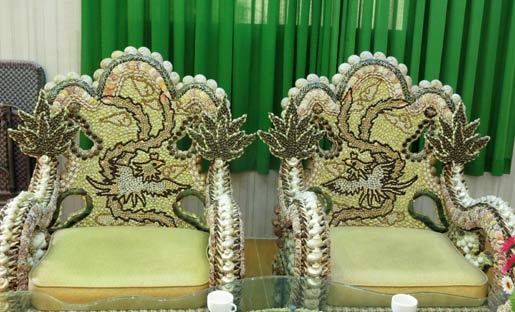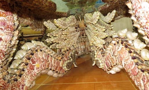 | Mỗi chiếc ghế lớn được thiết kế gắn các vỏ ốc, sò hình 2 con rồng chầu lên phía trước và điểm tựa của ghế là một con chim phượng tung cánh. |