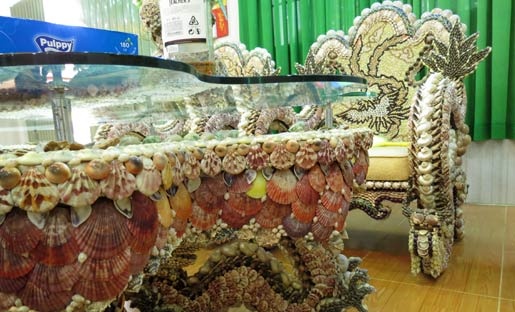 10 năm trước, bộ bàn ghế, ấm chén được chế tác công phu sau nhiều ngày ốp hàng triệu vỏ ốc, sò biển và được mang ra đấu giá gần 100 triệu đồng.