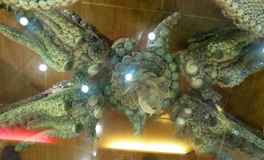 | Cận cảnh một chiếc ghế nhỏ được sắp xếp vỏ ốc, sò rất bắt mắt. |