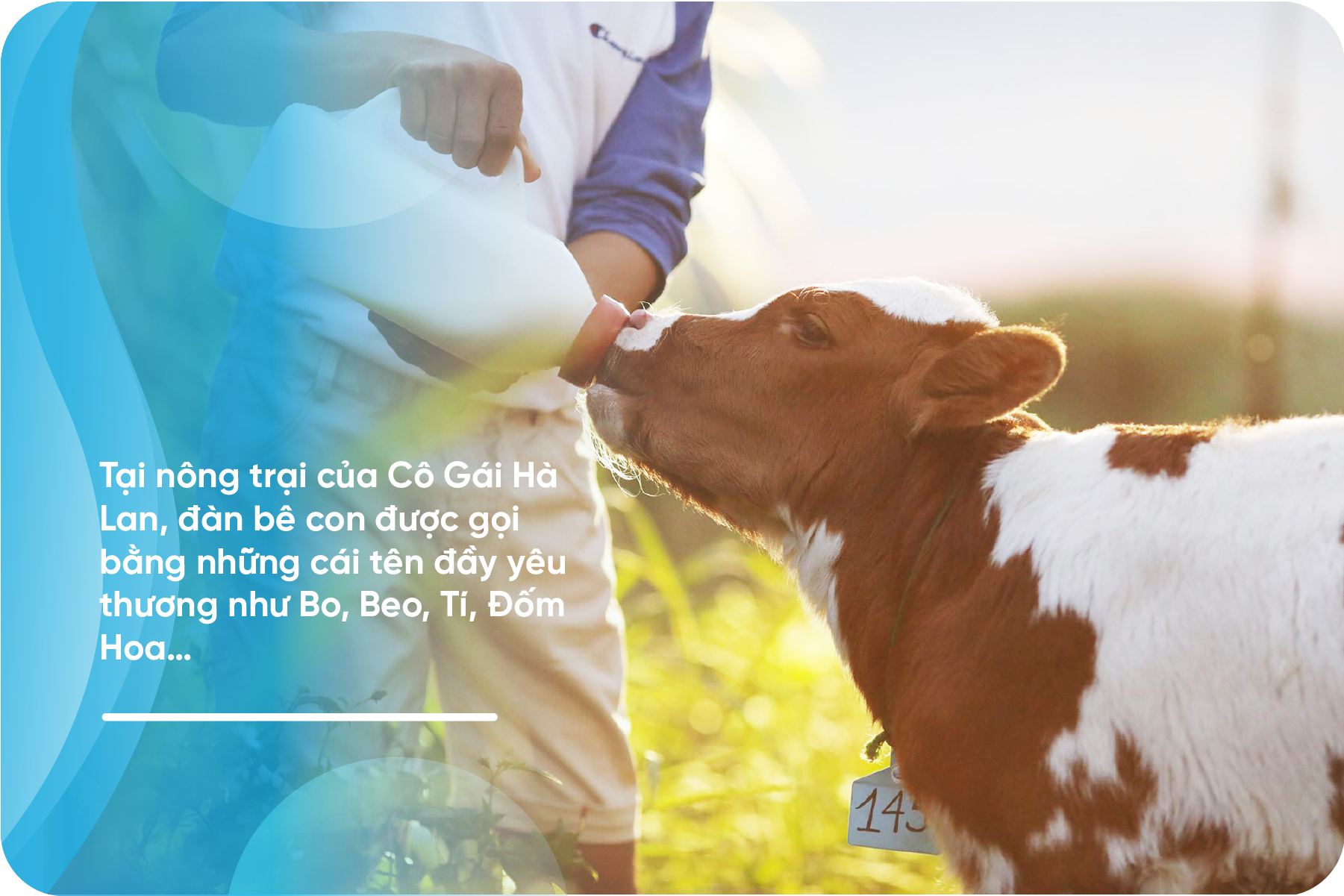 | Bo là một trong 38 bê con được chăm sóc và yêu thương như thành viên trong gia đình chị Khánh. Dù mỗi cô bò đều được đeo thẻ số để tiện quản lý, vợ chồng chị thích gọi chúng bằng những cái tên trìu mến như Bo, Beo, Tí, Đốm Hoa... bởi đó là cách chị giúp đàn bò cảm nhận được sự quan tâm, thoải mái và thư giãn hơn trong suốt quá trình phát triển. |