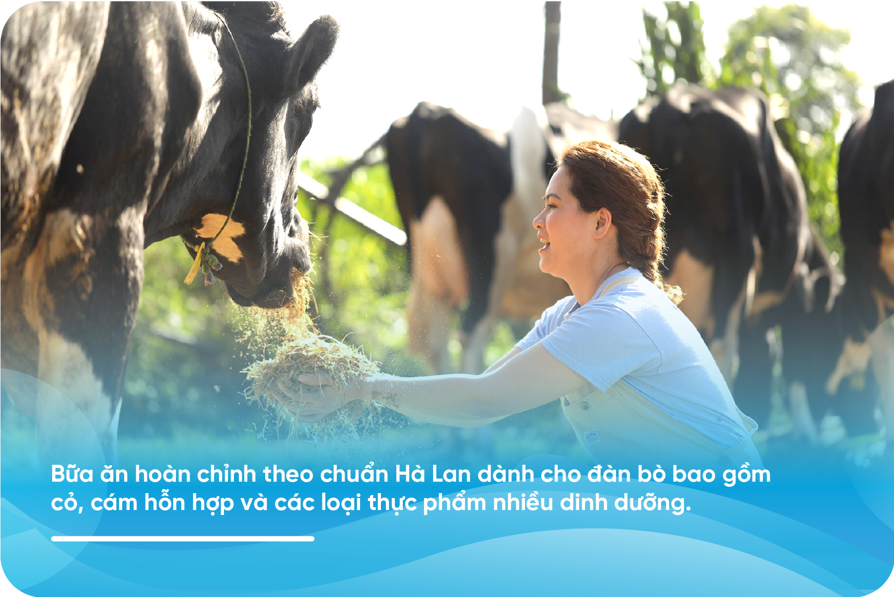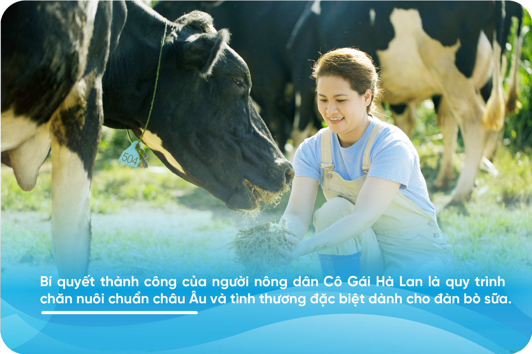 | Từ lúc khởi nghiệp với 4 cô bò sữa 20 năm trước, hiện tại nhà chị Khánh đã phát triển lên hàng trăm thành viên. Bí quyết phía sau thành quả đó là quy trình chăn nuôi chuẩn Hà Lan về quản lý, thức ăn và chuồng trại mà gia đình chị, cùng nhiều hộ nông dân khác đã được kế thừa từ di sản 145 năm của thương hiệu Cô Gái Hà Lan. |