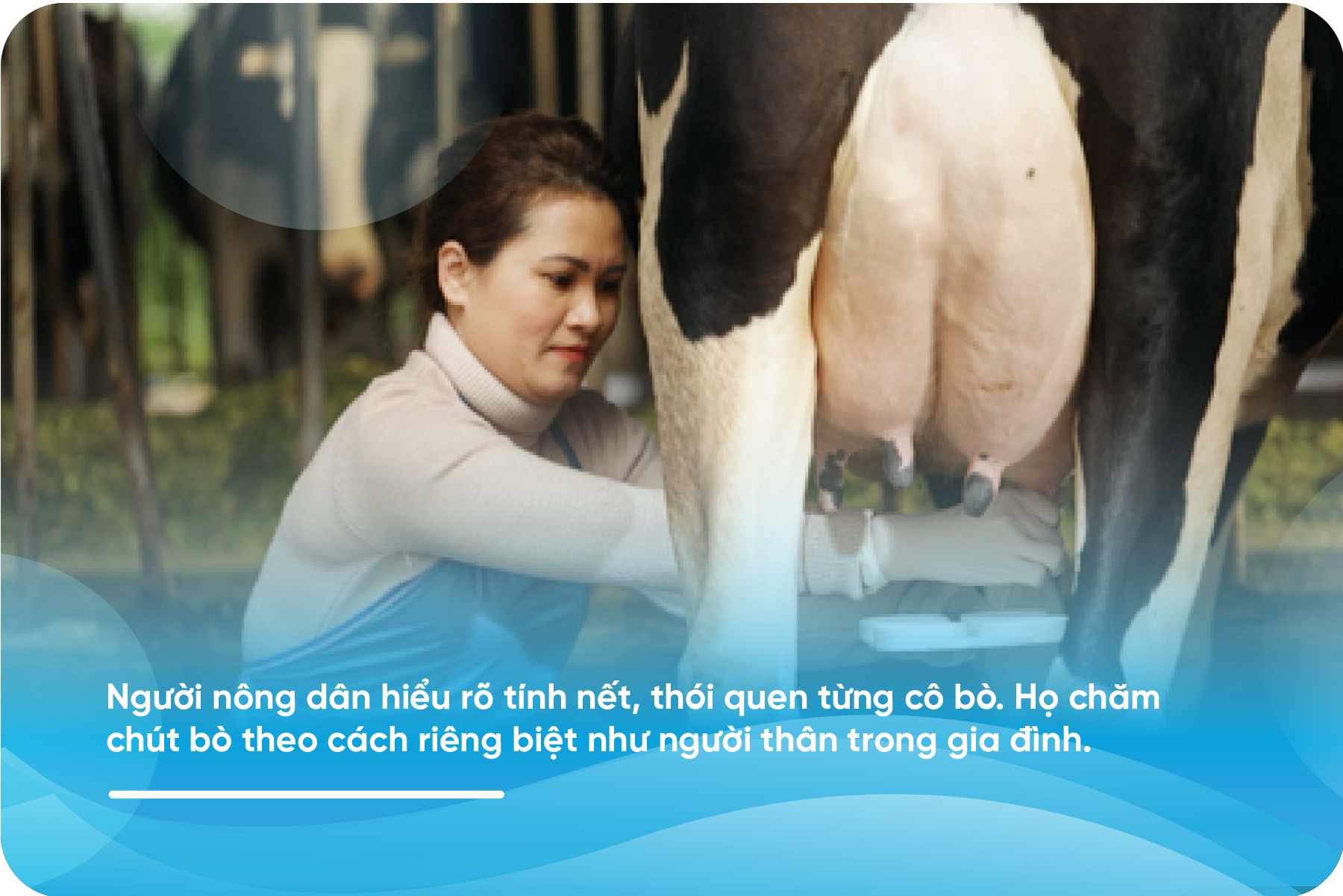 | Quy trình vắt sữa là điểm khắt khe nhất người nông dân luôn phải ý thức. Không những tuân thủ chặt chẽ kỹ thuật vắt sữa, họ còn phải hiểu tính nết từng cá thể bò trong đàn. “Lúc được vắt sữa là lúc bò thoải mái nhất. Chăm bò phải hiểu tính nết từng bé mới chăm được”, chị Khánh chia sẻ. Có những cô bò xuống sữa rất nhanh nên được ưu tiên vắt trước. Trình tự gắn cốc hút của máy vắt sữa vào vú nào trước, vú nào sau cũng phải tùy từng cô bò để vật nuôi luôn thoải mái và cho dòng sữa ngon nhất. |