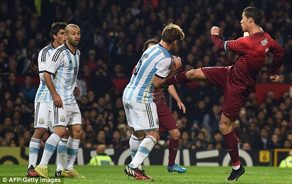 Phải rất hiếm hoi CR7 mới tung ra cú sút nhưng nó cũng dễ bị chặn lại bởi hàng phòng ngự bọc lót cho nhau rất tốt của Argentina.