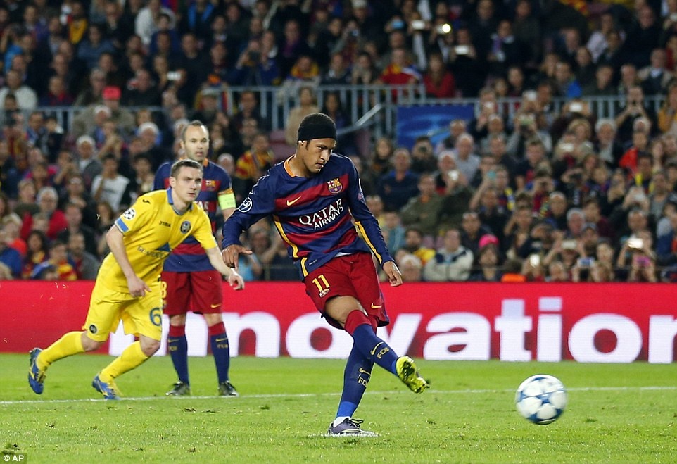 | Trên chấm 11 m, Neymar dễ dàng đánh lừa thủ môn đối phương để giúp đội nhà vươn lên dẫn trước. |