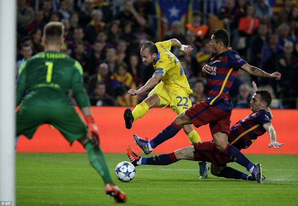 | Các cầu thủ BATE Borisov cũng tạo ra một vài cơ hội. Tuy nhiên, những pha dứt điểm của họ chưa đủ sắc sảo để khoan thủng hàng phòng ngự của Barca. |