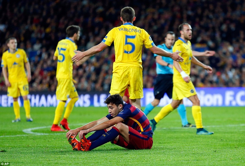 | Sau nửa giờ thi đấu, Munir El Haddadi mang về cho Barca quả penalty khi buộc hậu vệ Filip Mladenovic phạm lỗi trong vòng cấm. |