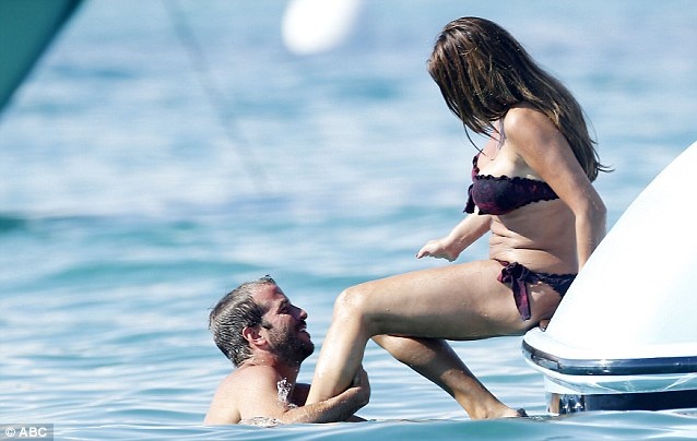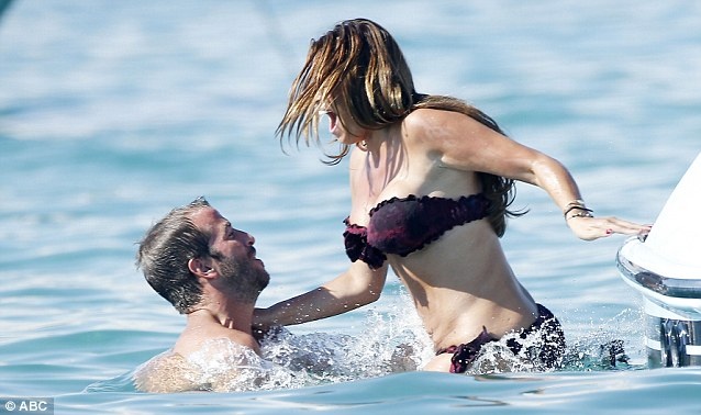 Cô bồ già của Van der Vaart vô tư chỉnh áo ngực giữa biển để tránh sự cố "lộ hàng" đáng tiếc xảy ra. Dù đã là bà mẹ 2 con và thân hình không còn thon gọn nhưng Sabia Boulahrouz vẫn khiến đấng mày râu mê mẩn với vòng 1 đồ sộ, quyến rũ.