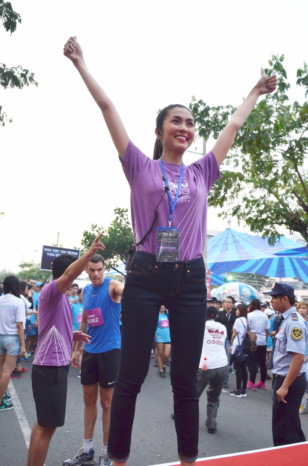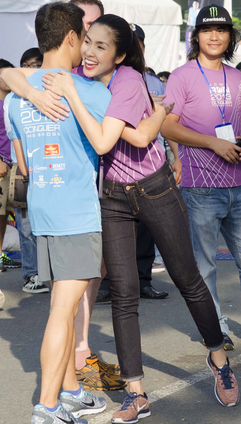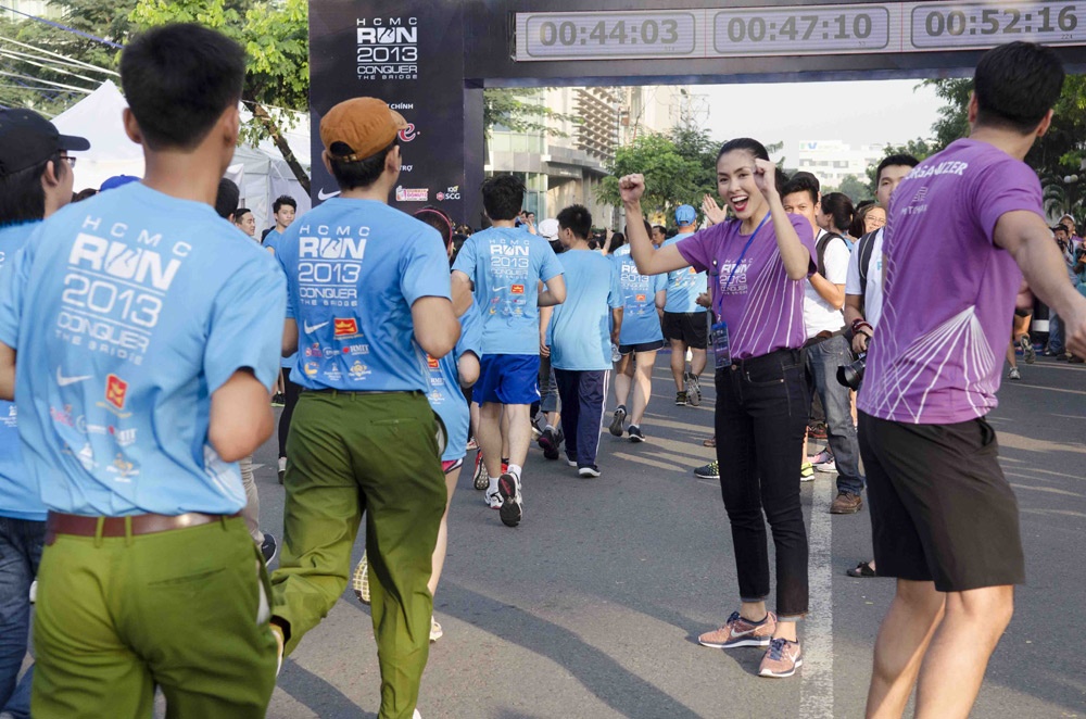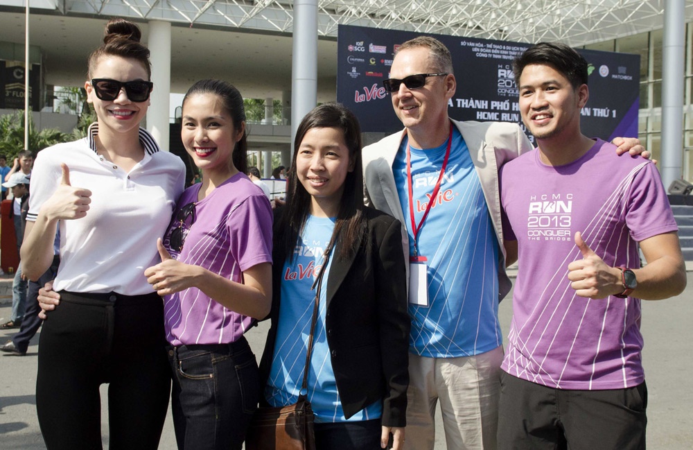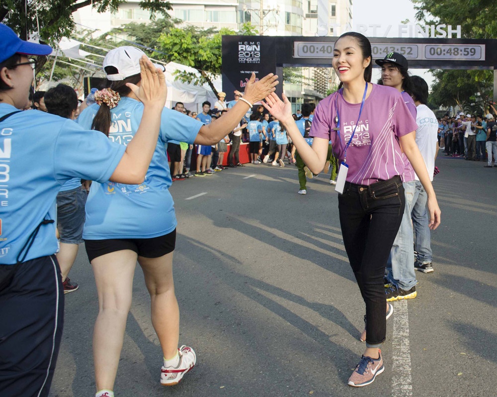 Ngay từ 5 giờ sáng, bà xã của Cường Đô la đã có mặt tại tại khu Cresent Mall quận 7, TP.HCM để cổ vũ cho các vận động viên. Hà Tăng rất vui khi Hồ Ngọc Hà và nhiều đồng nghiệp đến cổ vũ cho giải chạy của mình.