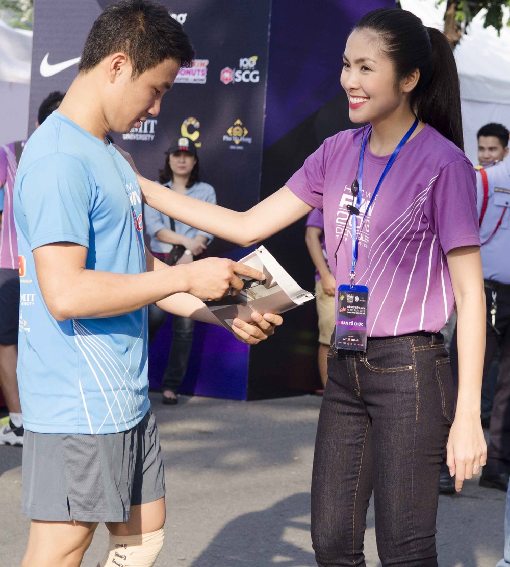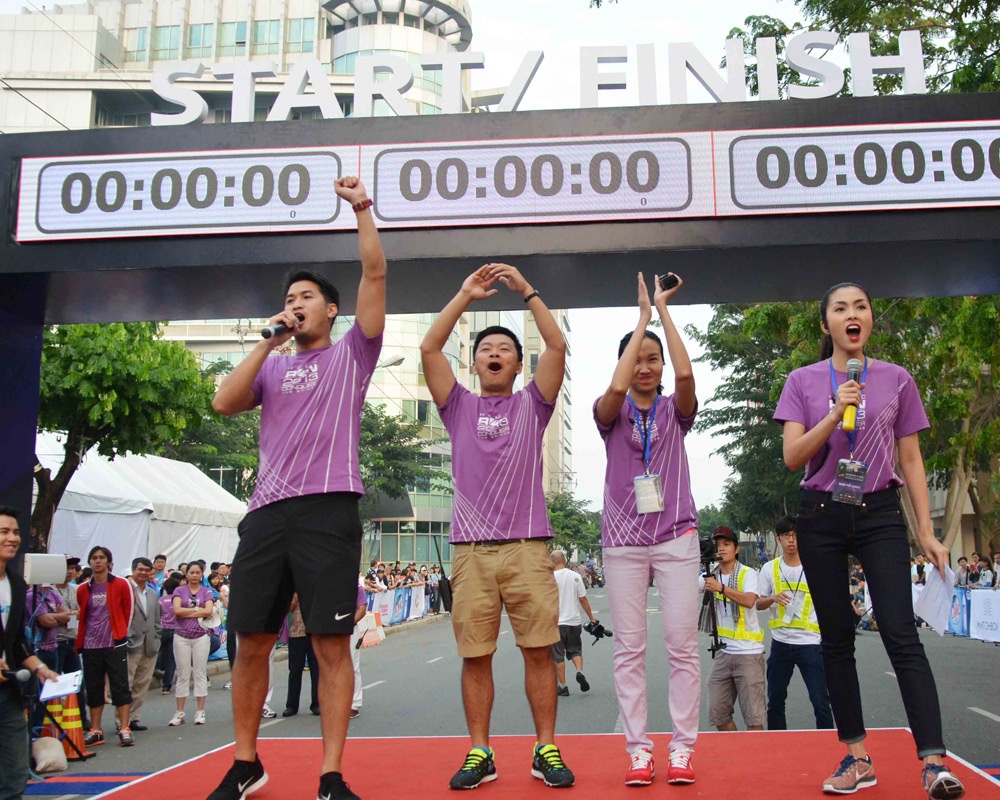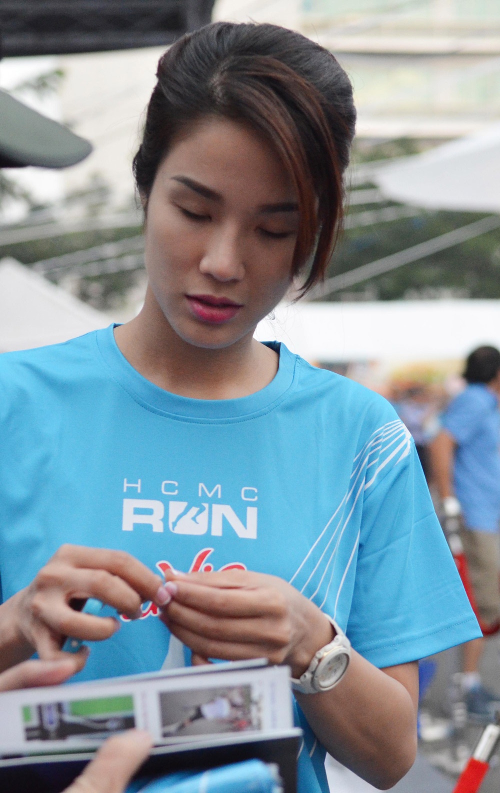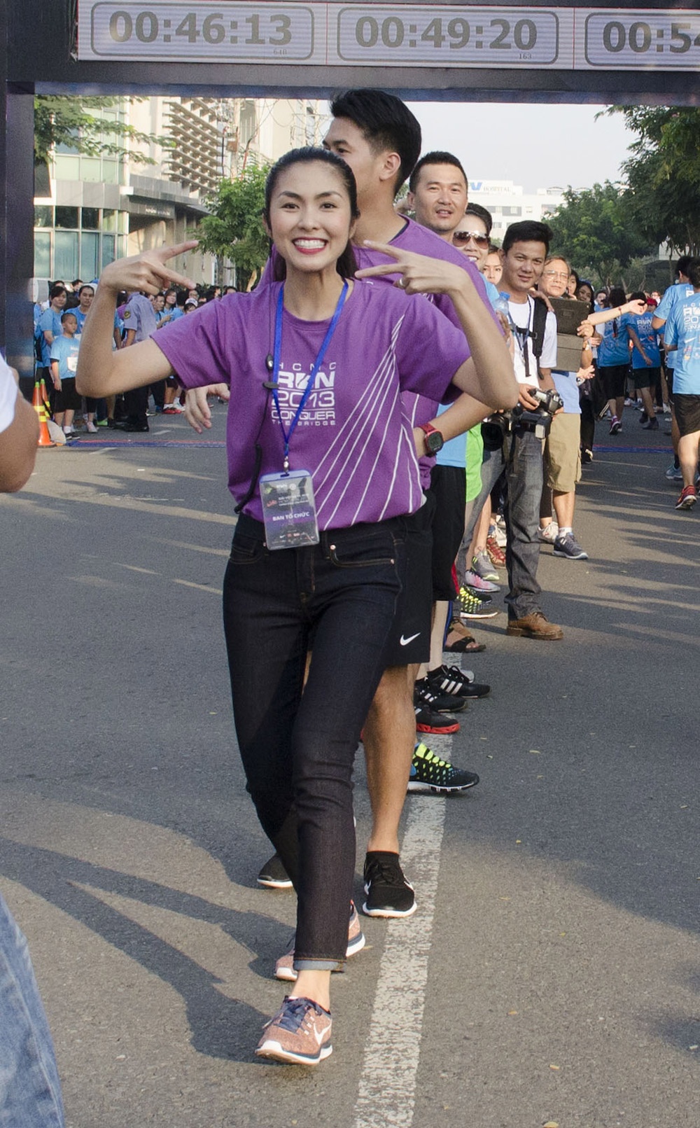 Ngay từ 5 giờ sáng, bà xã của Cường Đô la đã có mặt tại tại khu Cresent Mall quận 7, TP.HCM để cổ vũ cho các vận động viên. Hà Tăng rất vui khi Hồ Ngọc Hà và nhiều đồng nghiệp đến cổ vũ cho giải chạy của mình.