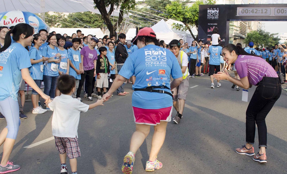 | Cô bắt tay từng vận động viên khi sắp cán đích. HCMC Run 2013 đã có một mùa giải ấn tượng, thu hút mọi giới tham gia, trong đó có rất nhiều người nước ngoài, trẻ em, người già. Theo ban tổ chức, giải việt dã này sẽ được duy trì mỗi năm một lần và mùa giải tới sẽ có cự ly 21km và 42km. |
