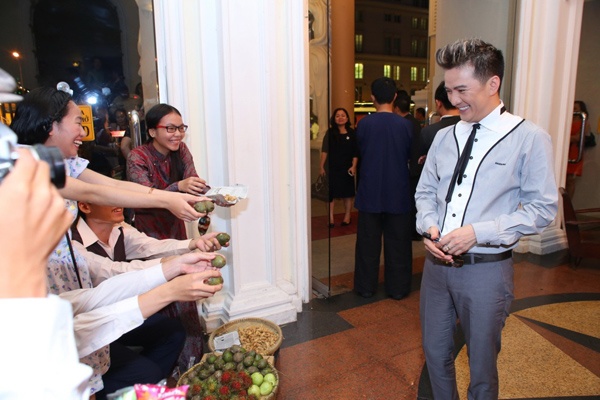 | Mr.Đàm ra tận cửa nhà hát để đón vợ chồng doanh nhân nổi tiếng. Họ chào nhau bằng cái ôm tình cảm. Nam ca sĩ rất vui khi vợ chồng doanh nhân Thủy Tiên tranh thủ sắp xếp thời gian "vàng" đến nghe anh hát. |