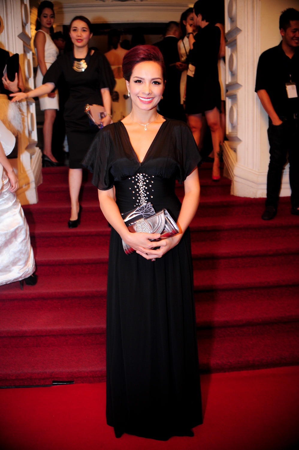 Diện bộ đầm ren đen tuyền, bà mẹ một con Xuân Lan tự tin tạo dáng trên thảm đỏ. Đi kèm trang phục tối màu là tông trang điểm nổi bật.