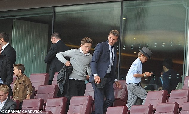 | Bốn bố con nhà Becks trong lần dự khán Emirates xem Arsenal thi đấu. Hiện tại cậu thứ Romeo (đội mũ) cũng đang được cựu danh thủ MU cho ăn tập trong màu áo Pháo thủ. |