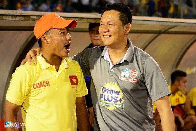 | HLV Nguyễn Quốc Tuấn của U21 HAGL (phải) là người khơi mào cuộc chiến với đồng nghiệp và cũng là đồng đội cũ Phạm Minh Đức. Ảnh: Đăng Văn. |
