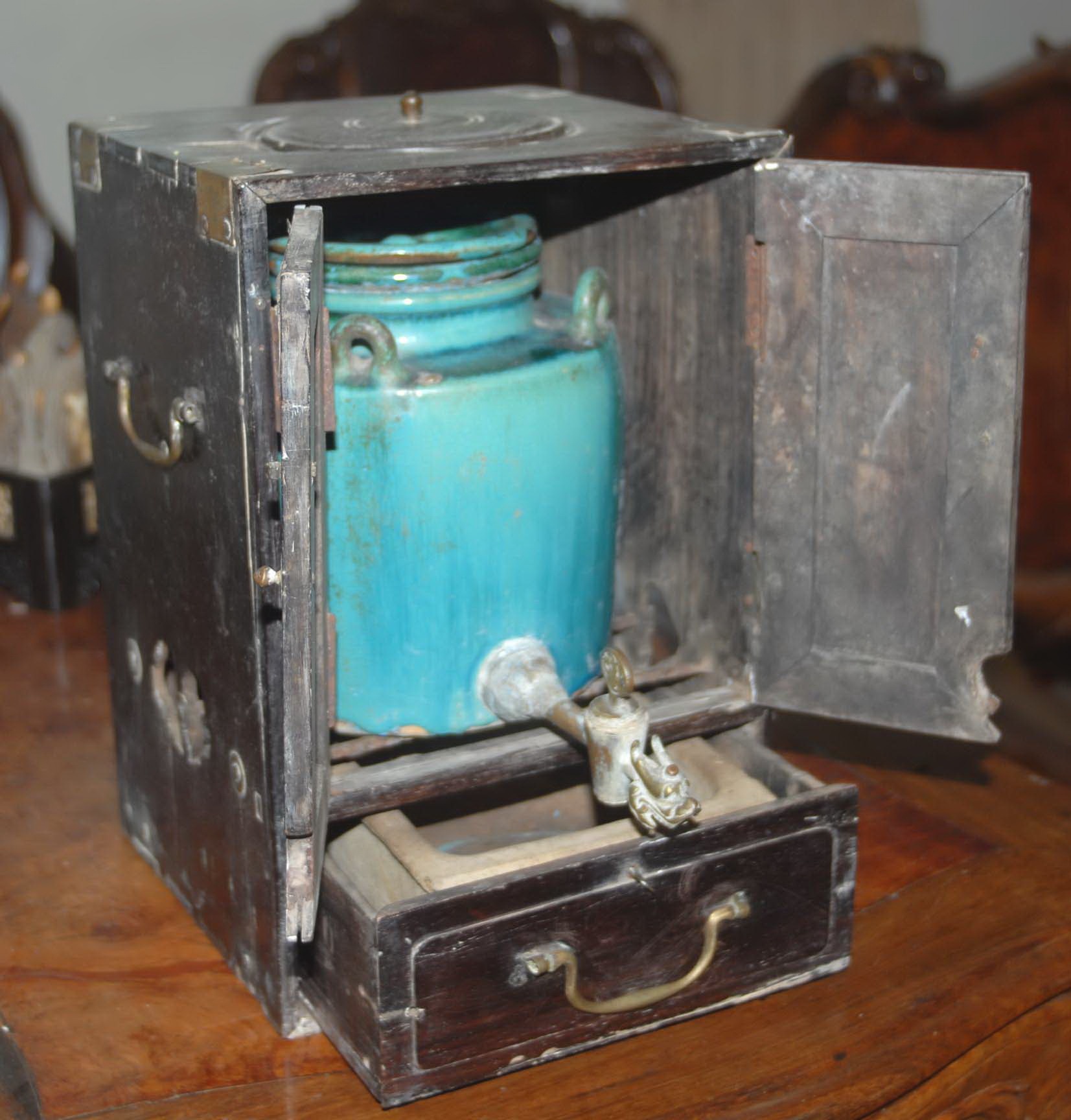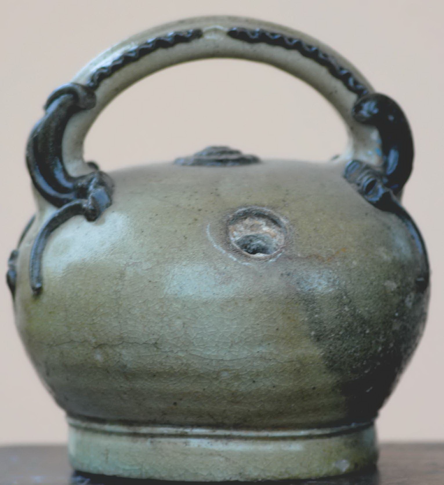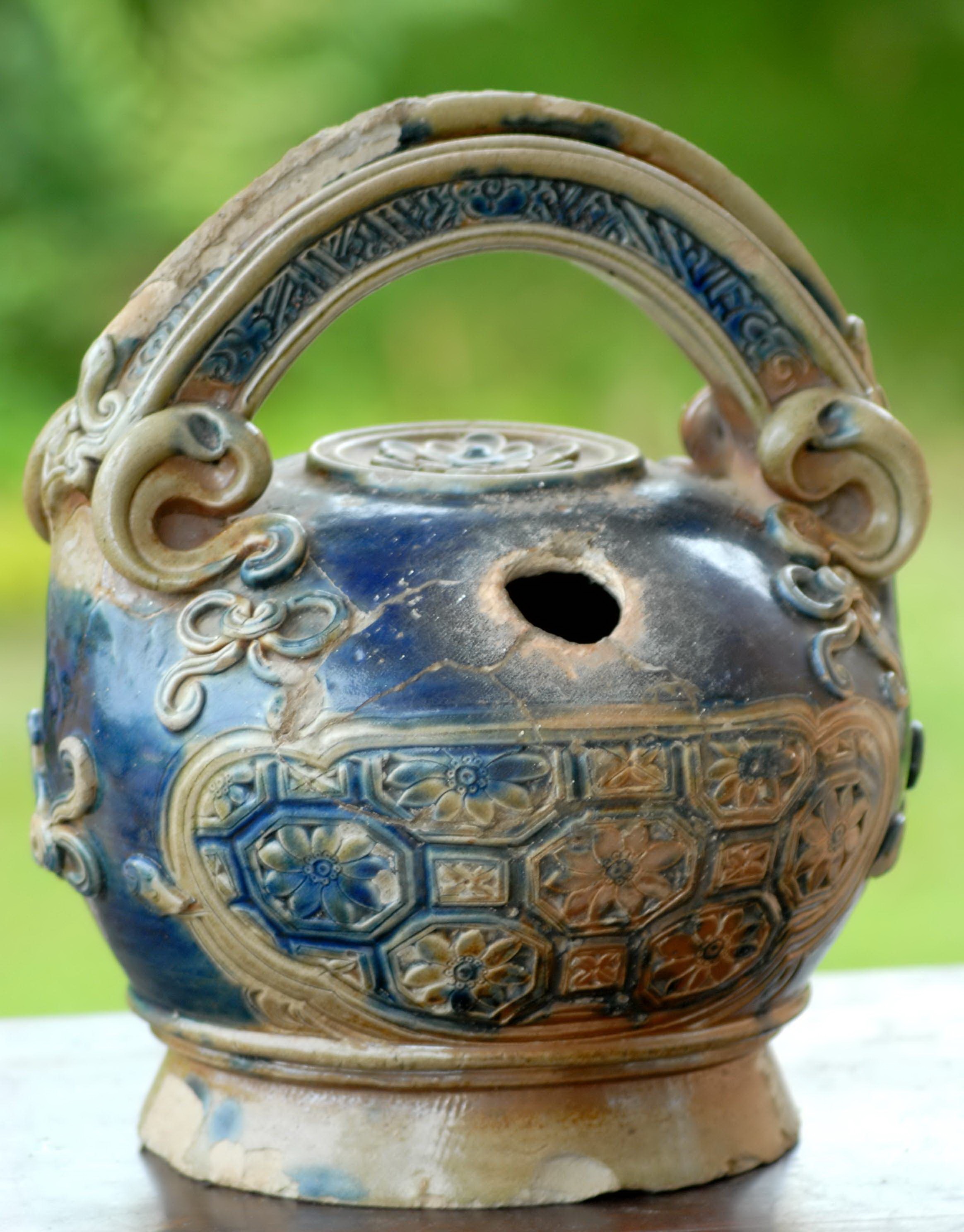 Đây là một bình vôi tráng men xanh vào thế kỷ 18. "Người Nam bộ xưa phần lớn đều ăn trầu. Trầu cau cũng đóng vai trò mai mối se duyên. Trong ngày cưới càng không thể thiếu mâm trầu bình vôi. Trong khi các cụ ăn trầu quét vôi thì cô dâu chú rễ cũng dâng mâm trầu cau khẳng định sự gắn bó bên nhau suốt đời. Cũng từ đó mà bình vôi lần lượt ra đời, từ cái nhỏ có thể bỏ trong bóp, khay cho đến những cái lớn như “Ông bình vôi” chứa cả mấy ký vôi", ông Đoàn chia sẻ thêm cơ duyên sưu tầm bình vôi cổ của mình.