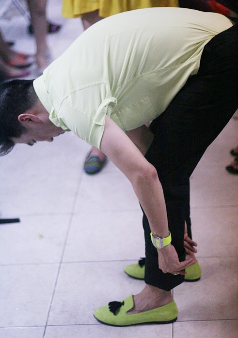 | Tông màu vàng chanh của phụ kiện giày và đồng hồ ăn nhập với áo sơ-mi. |