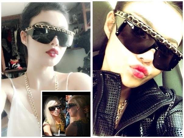 | Julia Hồ sở hữu chiếc kính có phong cách hiện đại mạnh mẽ của Chanel. Mẫu kính này từng được Lady Gaga sử dụng. Mẫu kính có phần dây xích trên gọng giúp tăng hiệu ứng cá tính. |