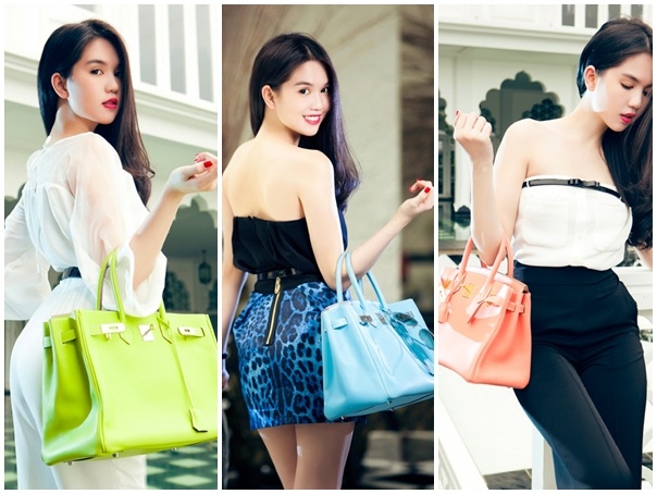 Những chiếc túi Hermes trị giá hơn 5 ngàn USD được Ngọc Trinh sử dụng kết hợp cùng nhiều trang phục.