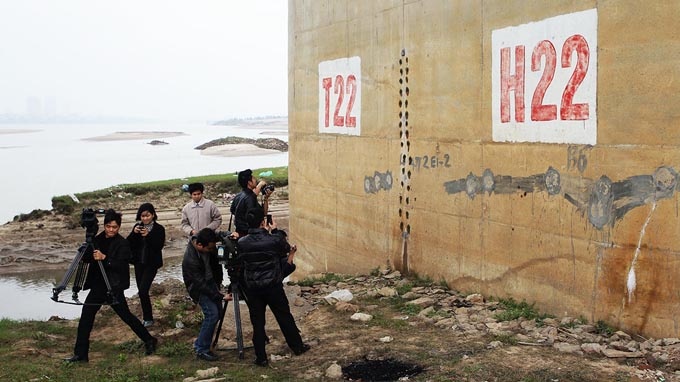 | Vết nứt xuất hiện ở trụ T22 cầu Vĩnh Tuy. |