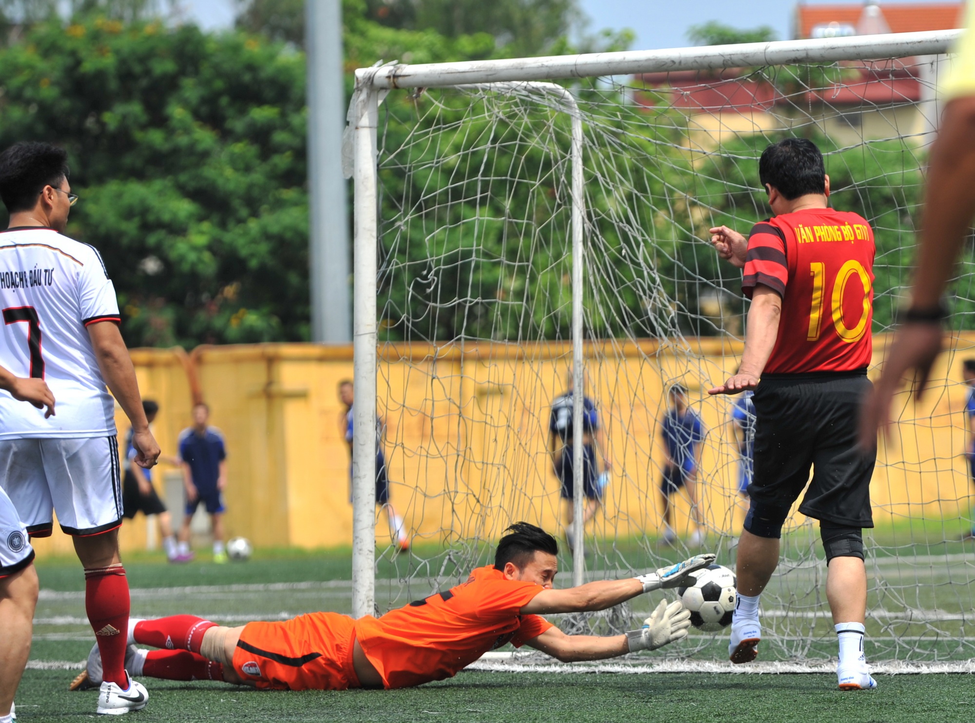 | Tuy nhiên tiền đạo mang áo số 10 của đội Văn phòng Bộ GTVT dùng má trong chân phải khống chế bóng gọn gàng, nhanh chóng đi bóng khéo léo áp sát khung thành đối phương. |