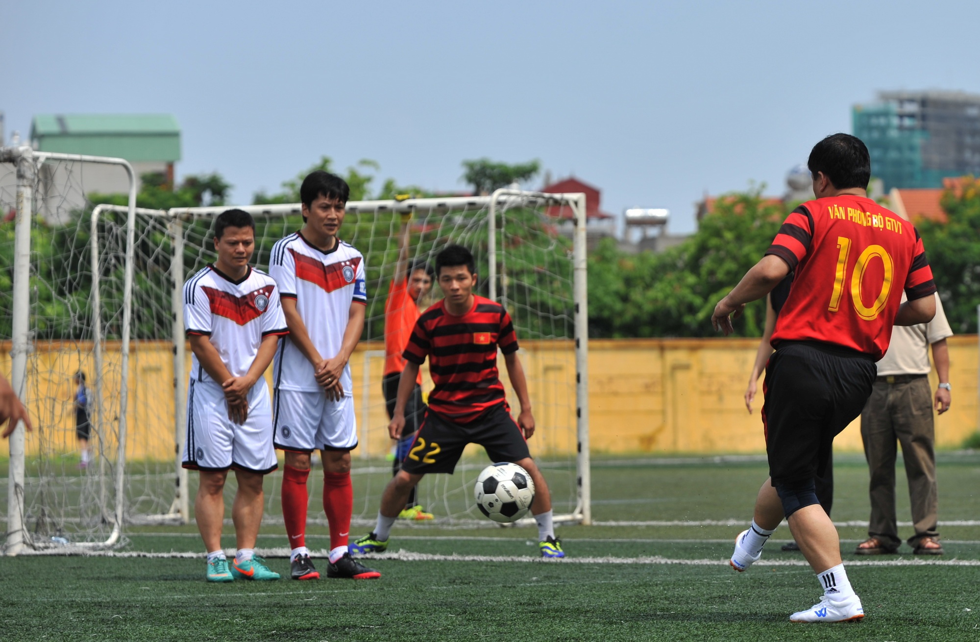 | Bộ trưởng Đinh La Thăng ra sân với chiếc áo số 10, chơi ở vị trí tiền đạo và mang băng đội trưởng đội bóng Văn phòng Bộ GTVT. Giải Ngày hội bóng đá thi đấu trên sân cỏ nhân tạo 7 người, mỗi trận đấu kéo dài liên tục trong 20 phút. |