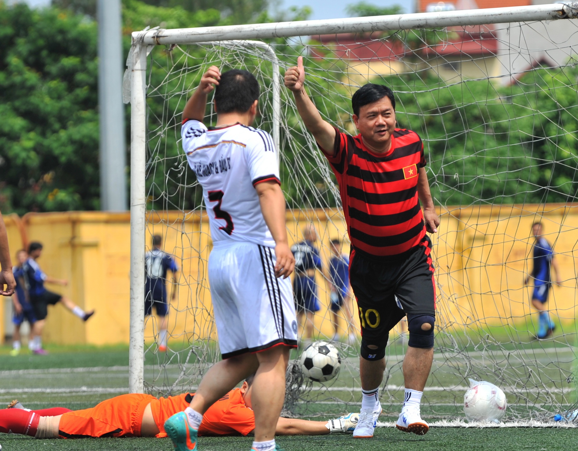 | Bước vào vòng đấu loại trực tiếp và vòng bán kết, bộ trưởng Thăng ghi thêm 2 bàn thắng giúp đội nhà tiến thắng vào trận chung kết gặp đội bóng Đại sứ quán Anh. |