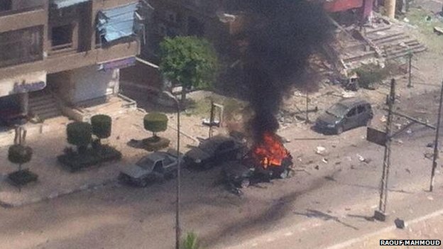 | Một xe hơi bốc cháy trong vụ đánh bom nhằm vào Bộ trưởng Nội vụ Ai Cập hôm 5/9. Ảnh: BBC. |