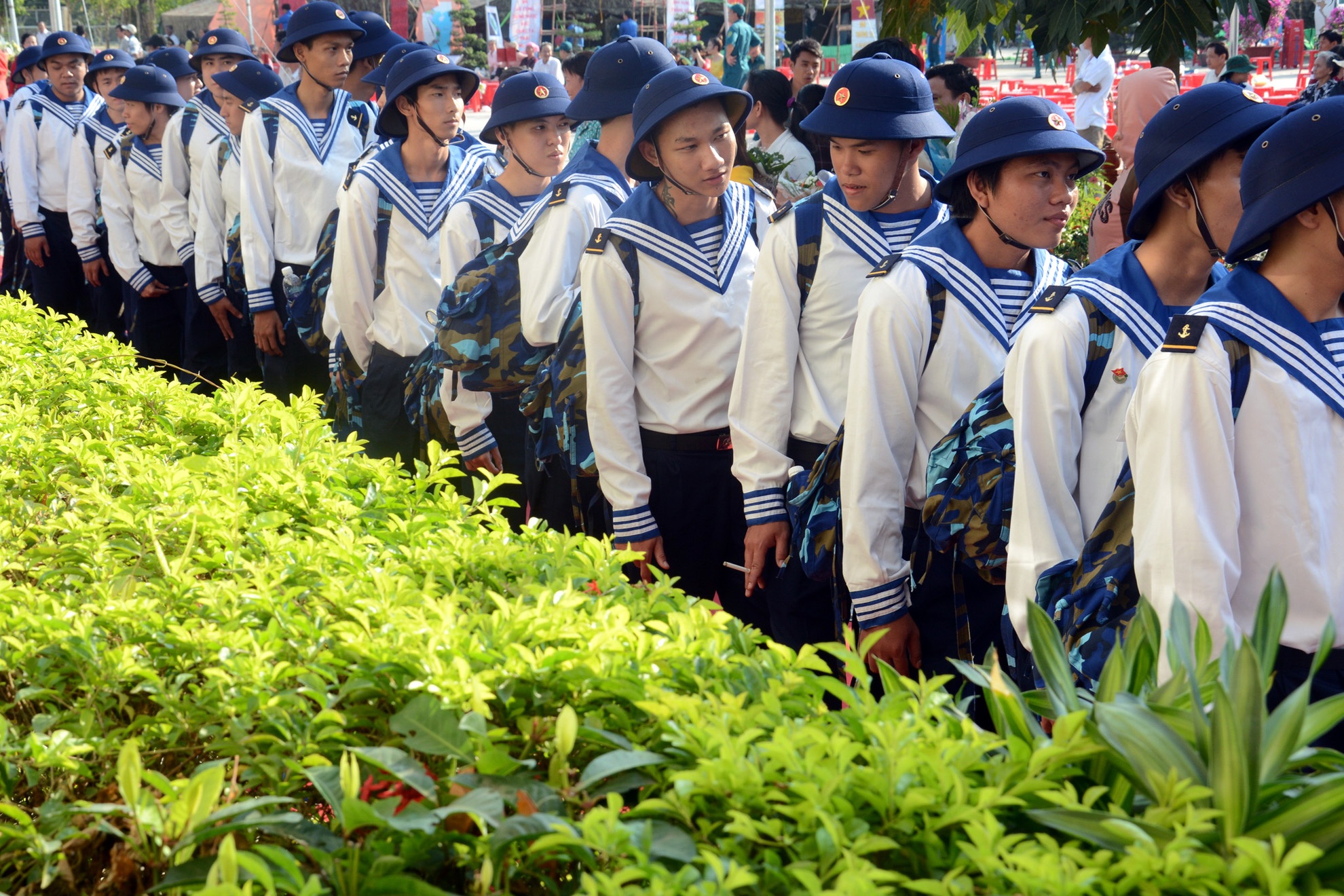 | Các tân binh sẽ về nhiều đơn vị như Lữ đoàn 957 Hải quân, Tiểu đoàn vệ binh 180 quân khu 7, Trung Đoàn 4 (Sư Đoàn 5, quân khu 7), Bộ Tư lệnh và Công an TP. Trong ảnh: Rất đông người thân, bạn bè có mặt tại từ sáng sớm để tiễn các thanh niên lên đường ngập ngũ. |