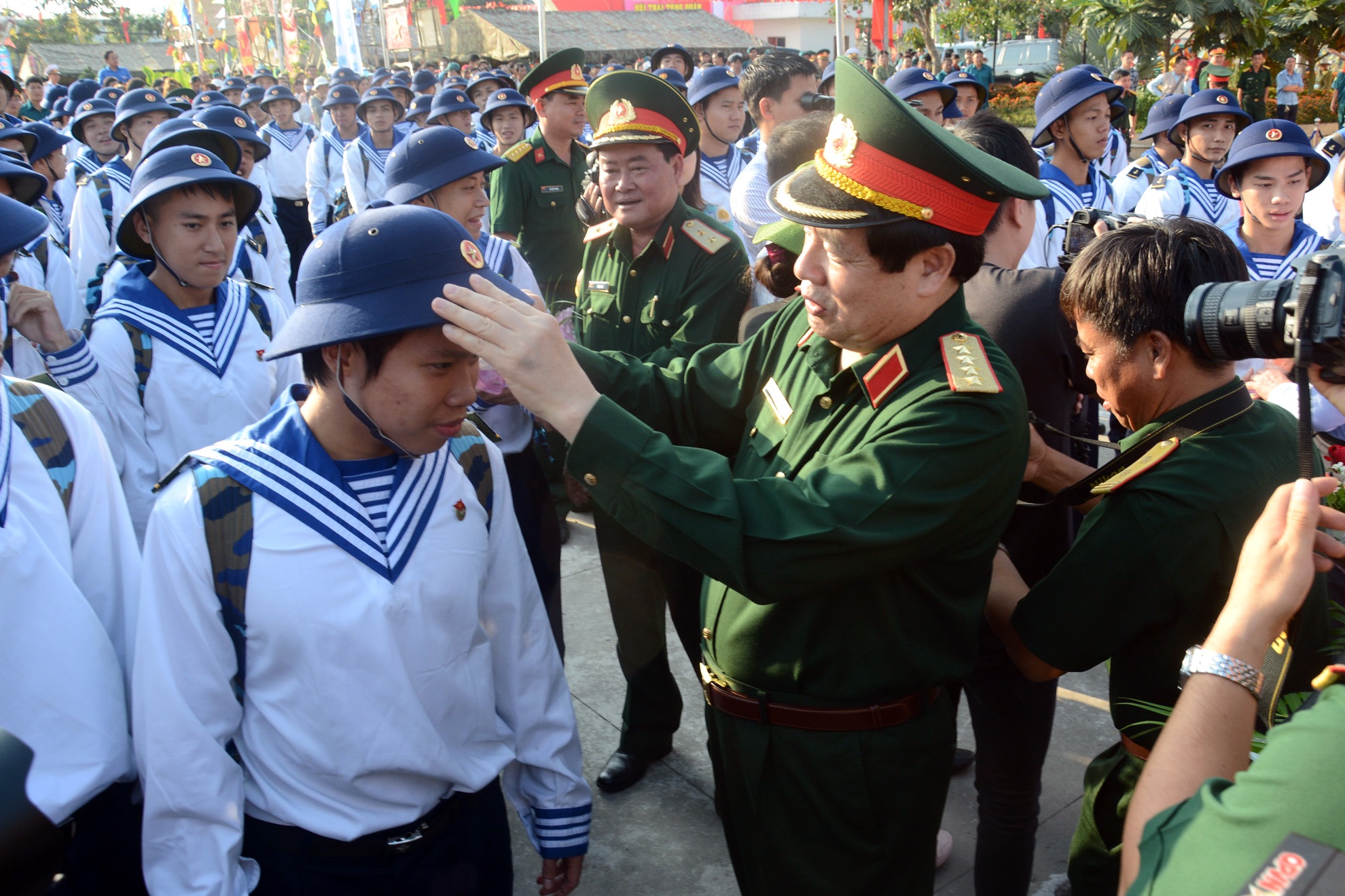| Bộ trưởng Quốc phòng, đại tướng Phùng Quang Thanh tham dự buổi lễ, động viên tân binh hoàn thành tốt nhiệm vụ. |